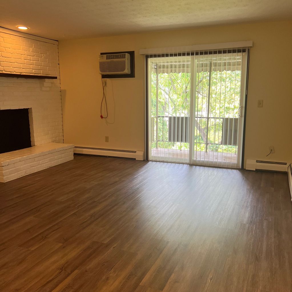 View of Living Room Area with A/C, Balcony and Wood-Burning Fireplace